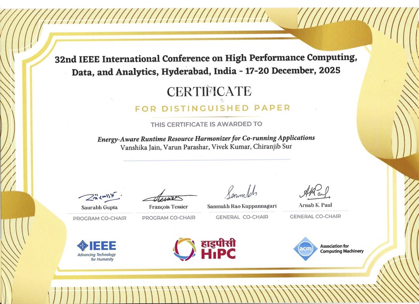 » Vanshika's HiPC'25 paper received the Best Paper Award.» Vanshika's received IEEE TCPP and Murthy Trust travel grants for HiPC'25 conference.